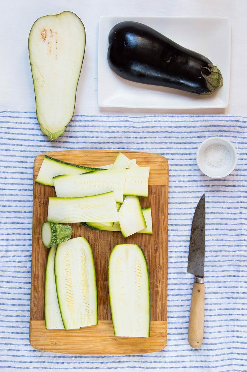 Empezamos con las verduras. Tenemos que cortar tanto el calabacín como la berenjena en láminas más o menos uniformes, para esto cortamos la parte redondeada de las verduras, los extremos y no quedamos con el centro. Ahora cortamos las verduras en láminas finas. En las fotos lo veréis mejor.
