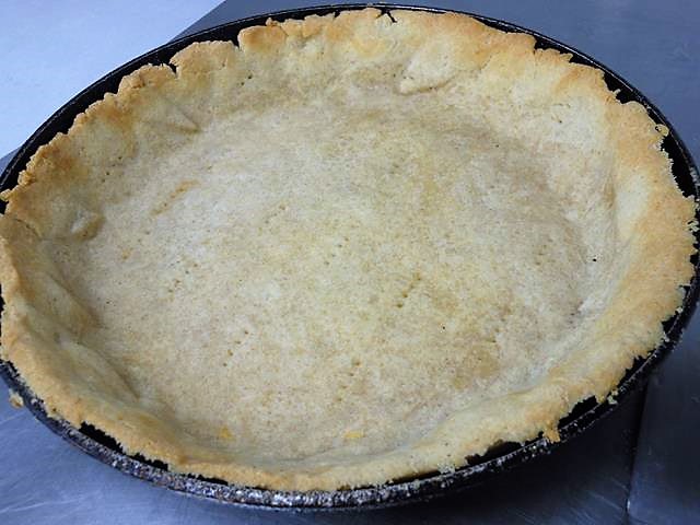 Estirar con el rodillo sobre papel sulfurizado para que nos quede fina. Cubrir un molde de unos 18 cms o una sartén y cocer la masa en blanco (pinchar la masa, poner papel sulfurizado y legumbres para que no suba. Hornear 15 min- 180º) reposar 30 minutos antes de utilizar.
