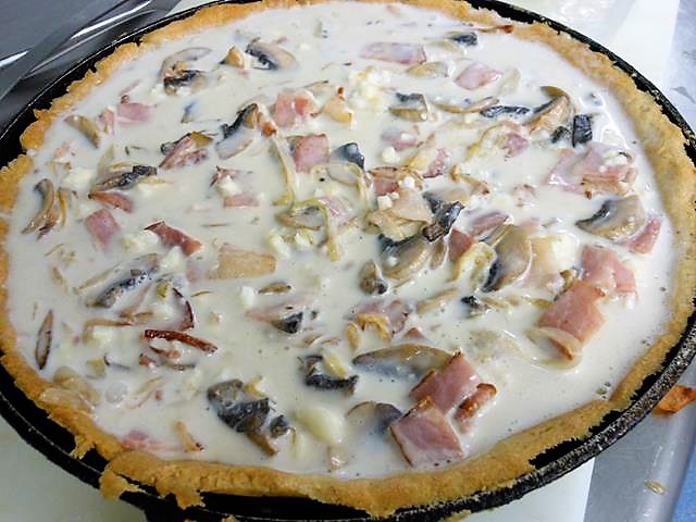 Mezclar la leche, la nata (crema de leche), los huevos batidos, la cebolla, los champiñones, el beicon, el queso.
