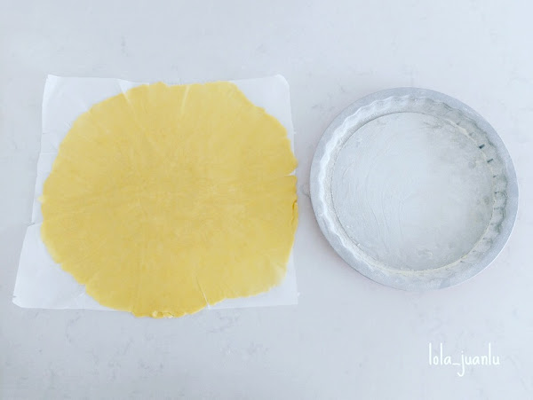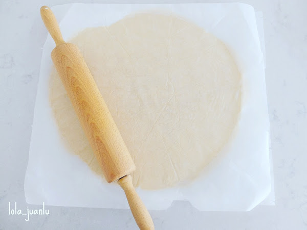 Transcurrida la media hora, quitamos el film a la masa y la colocamos entre dos hojas de hornear. Así no necesitaremos harina y no se pegará ni al rodillo ni a la superficie de trabajo. Con ayuda de un rodillo extendemos la masa hasta que cubra el molde y exceda unos centímetros pero no en demasía.