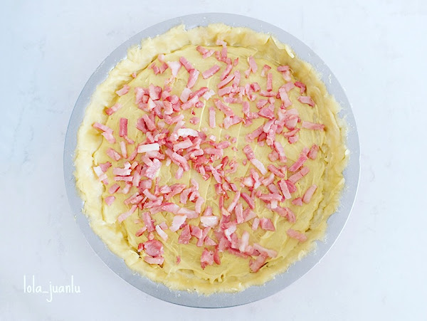 Sacamos la masa de la nevera. Extendemos una ligera capa de mostaza. A continuación, repartimos el bacon crujiente sobre la masa. Y por último vertemos el preparado de huevos.