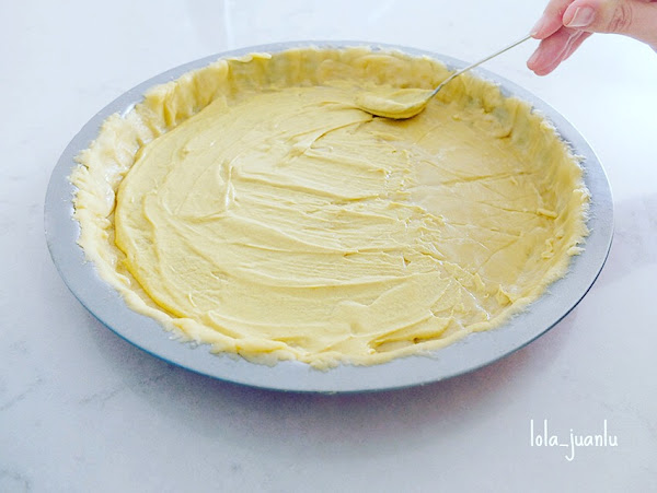 Ahora cubrimos la base con una capa de clara de huevo, que hará de barrera entre el relleno y la base, haciendo que el relleno no empape y ablande la masa.