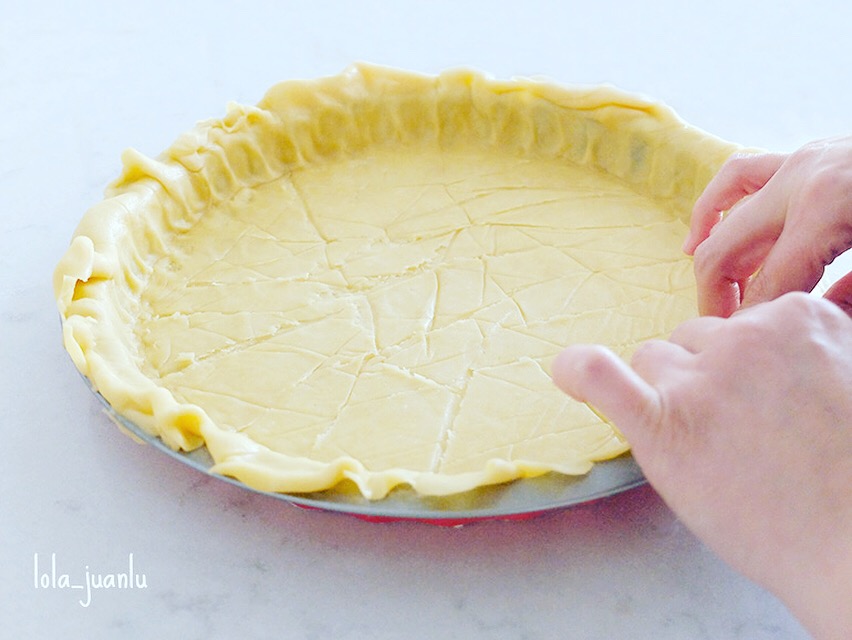 Quitamos el papel de hornear de la parte de arriba, colocamos sobre el molde, extraemos la otra hoja de papel y con ayuda de los dedos la vamos colocando correctamente empujándola suavemente contra el molde, hasta que encaje. Con la ayuda del palo de una cuchara de madera damos forma al borde de la masa. Una vez la masa esté bien pegada al molde cortamos los excedentes con ayuda del rodillo.