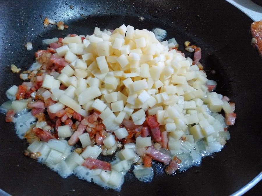 Si queremos hacerlo de manera tradicional, realizamos un sofrito con la cebolla y el bacon.