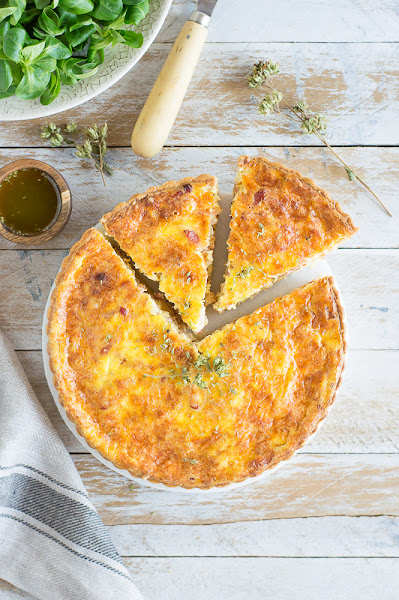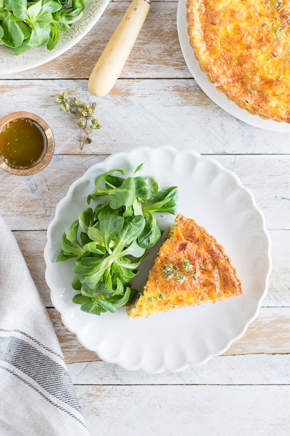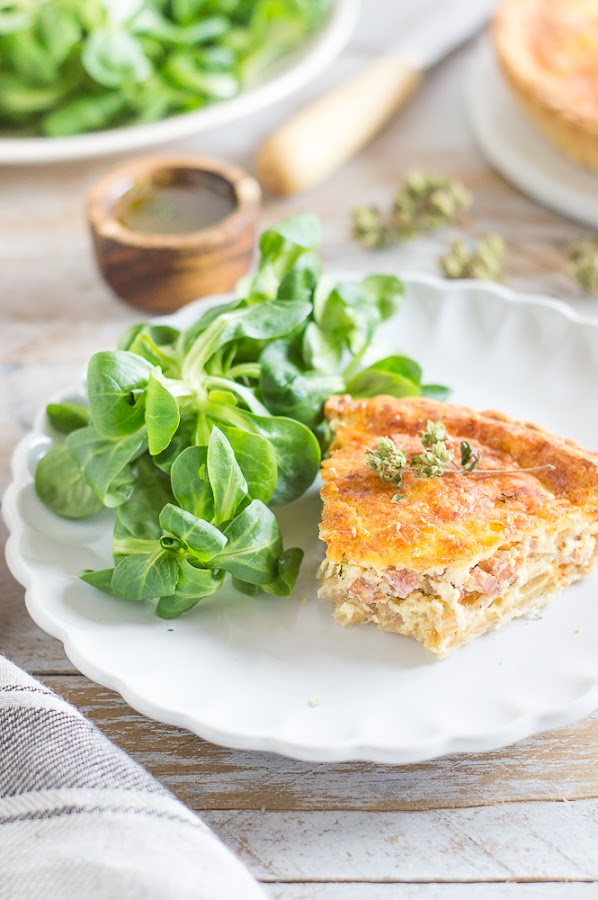 A pesar de lo mucho que me gustan las quichés, todavía no tenía subida al blog la más conocida de todas, la quiché Lorraine. Mi versión con crujiente masa quebrada casera con cremoso relleno de huevos, creme fraiche, cebolla, bacon, enmental y un toque de orégano está para no dejar ni las miguitas.