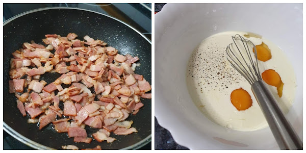 Mientras esta la base en el horno vamos salteando en una sartén el bacon cortado en trocitos evitando añadir aceite por no añadir mas grasa de la que tiene.