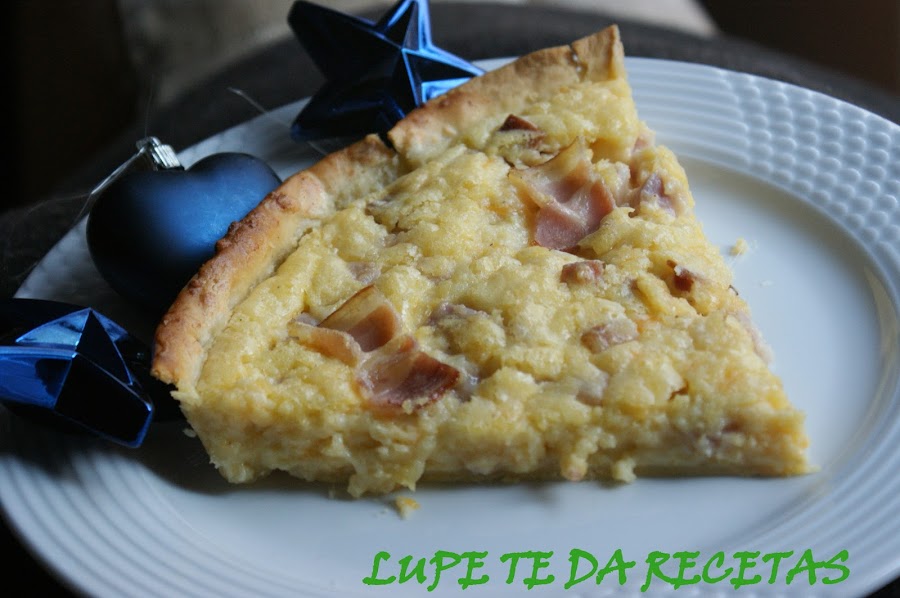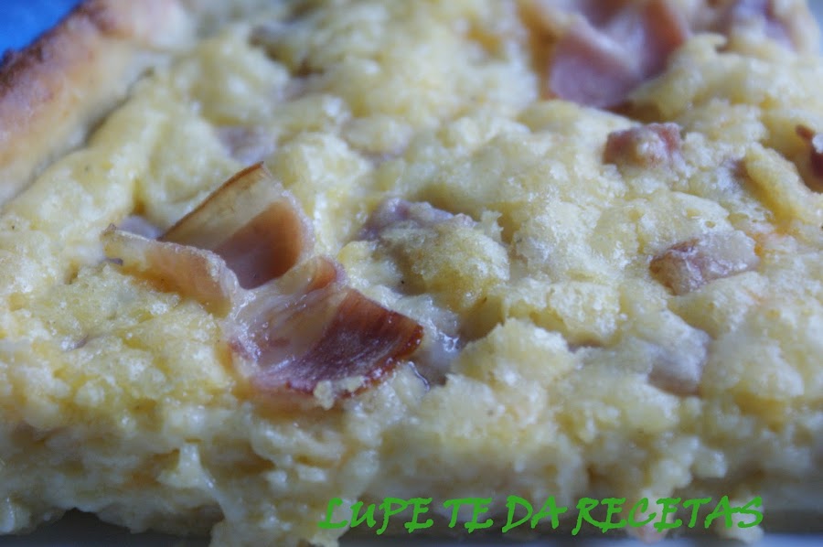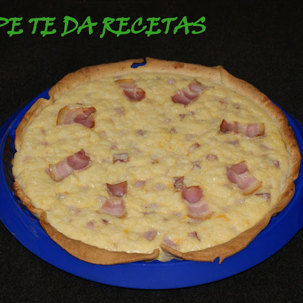 Cortar el bacon y mezclar con la bechamel, extender sobre la masa quebrada y sobre todo ello echar el queso rallado.