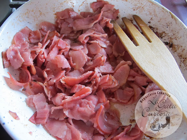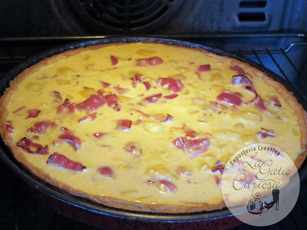 Distribuimos los trocitos de queso en la quiche, hacemos lo mismo con el bacon, rellenamos todo con la mezcla de huevos y nata (crema de leche) y horneamos durante unos 20 minutos, hasta que al pinchar nos salga limpio y veamos que la quiche está bien doradita.