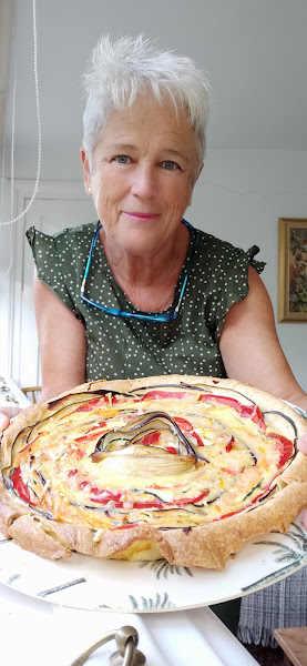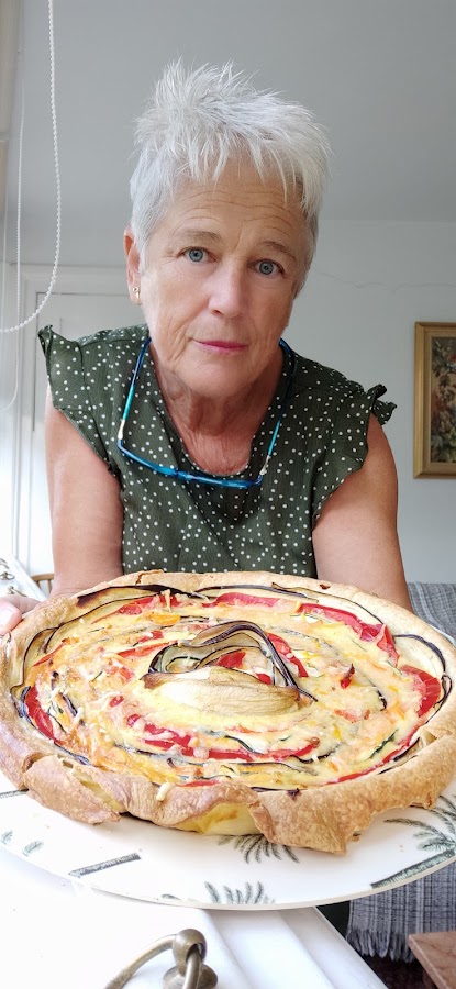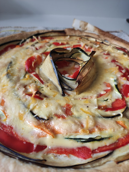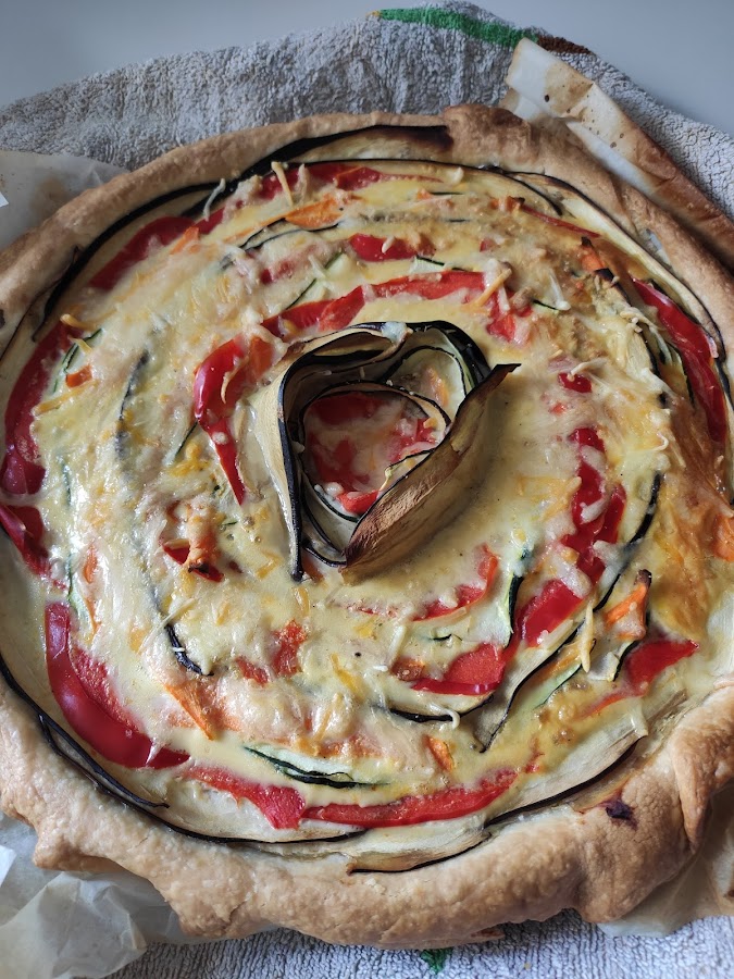 Ponemos en un molde la masa brisa, dejando el papel sulfurizado que viene con ella, y echamos el relleno. A continuación colocamos las verduras empezando desde afuera hacia el centro haciendo círculos completos de zanahoria, calabacín y berenjena. Echamos una pizca más de sal y pimienta cuando esté relleno del todo.