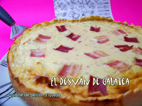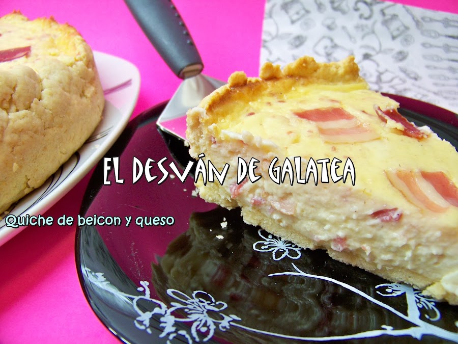 Verter el relleno sobre la masa quebrada, adornar con la loncha de beicon cortada en tiritas y llevar al horno a 180º durante 15 minutos.