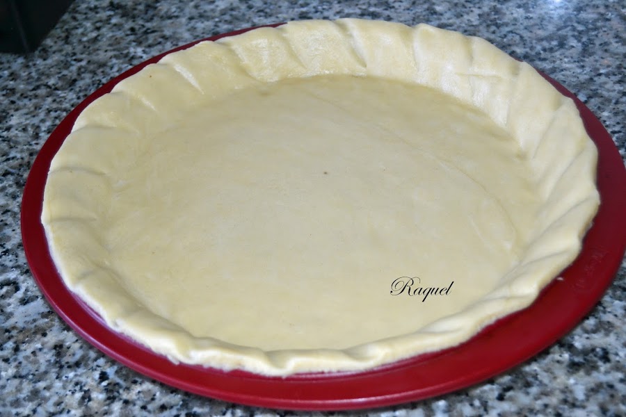 Pasada la hora, espolvoreamos el mármol con un poco de harina y estiramos con el rodillo la masa y ponemos sobre el molde, pincelándolo con un poco de aceite antes, para que no se pegue.