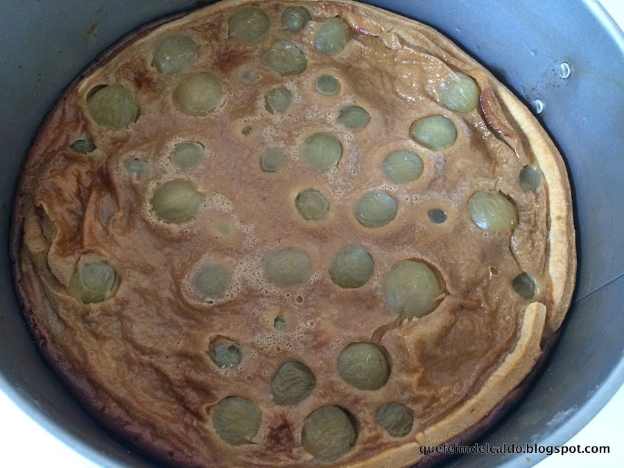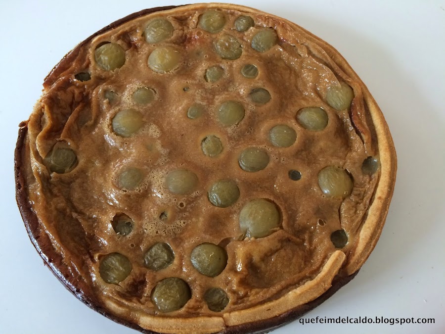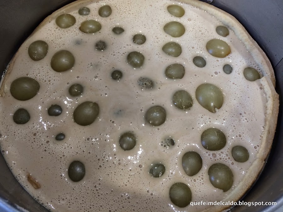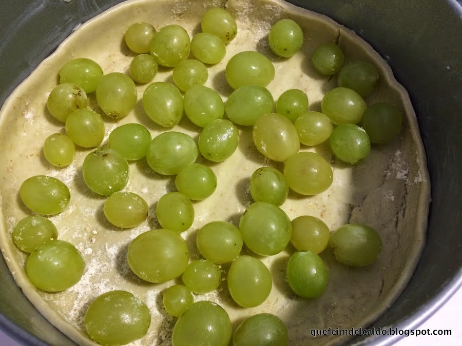 Transcurrido el tiempo de horneado de la masa, repartimos los granos de uva por el molde.