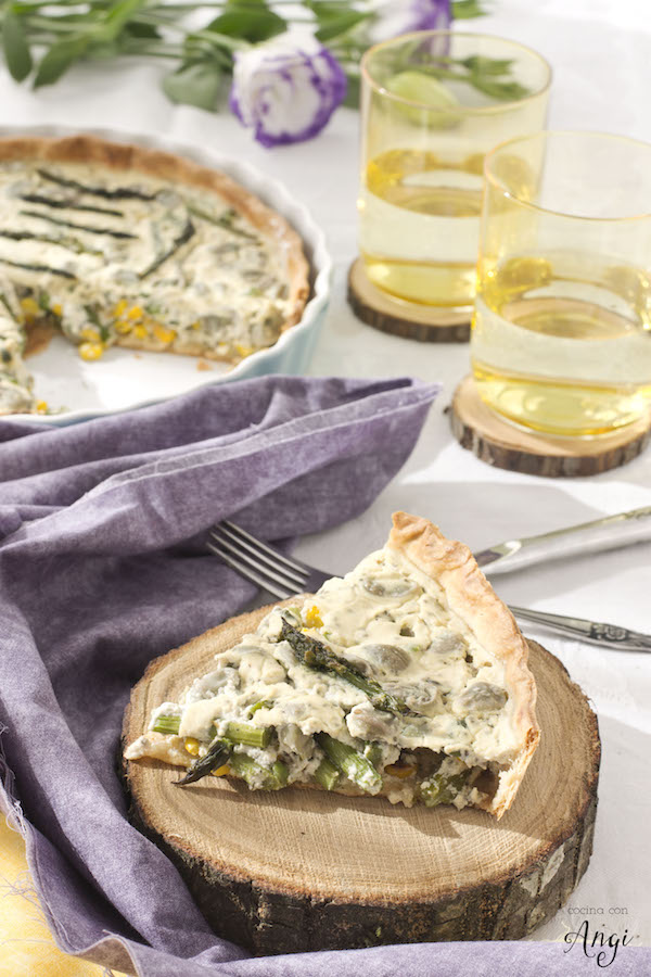 Para los más puristas esto sería un falsa quiche vegana con verduras de primavera ya que no lleva ni huevos, ni nata (crema de leche) de origen animal, ni leche, ni falta que le hace. Todo una homenaje a esta estación. Y no es que la primavera se esté portando especialmente bien conmigo este año, pero mira, tiene su aquel. Creo que desde el 1 de marzo que voy encadenando, resfriados, faringitis y la alergia que comparto con muchos de vosotros seguro... pero bueno, que el ánimo no decaiga y al menos cuidémonos y comamos rico.