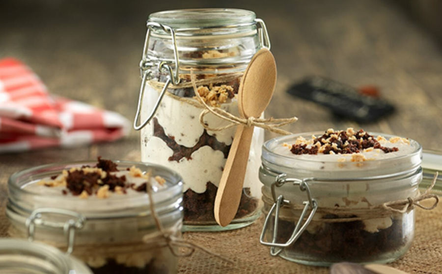 Decoración. Calentamos en un cazo cuatro cucharadas de nata con el turrón, que habremos desmenuzado previamente, y removemos suavemente hasta que veamos que se ha diluido. Ahora, vertemos en un bol grande el resto de nata fría y sumamos el azúcar y Natafix. Con la ayuda de las varillas eléctricas lo montamos. El siguiente paso es repartir la nata en dos partes (una la mezclaremos con el chocolate troceado y la otra con la crema de turrón). Para presentarlo, rellenamos los recipientes de cristal escogidos y lo haremos con capas superpuestas: primero la de tarta de chocolate desmenuzada, después las cremas, y así sucesivamente. En la parte superior ponemos un poquito de turrón y tarta, ambos desmenuzados.