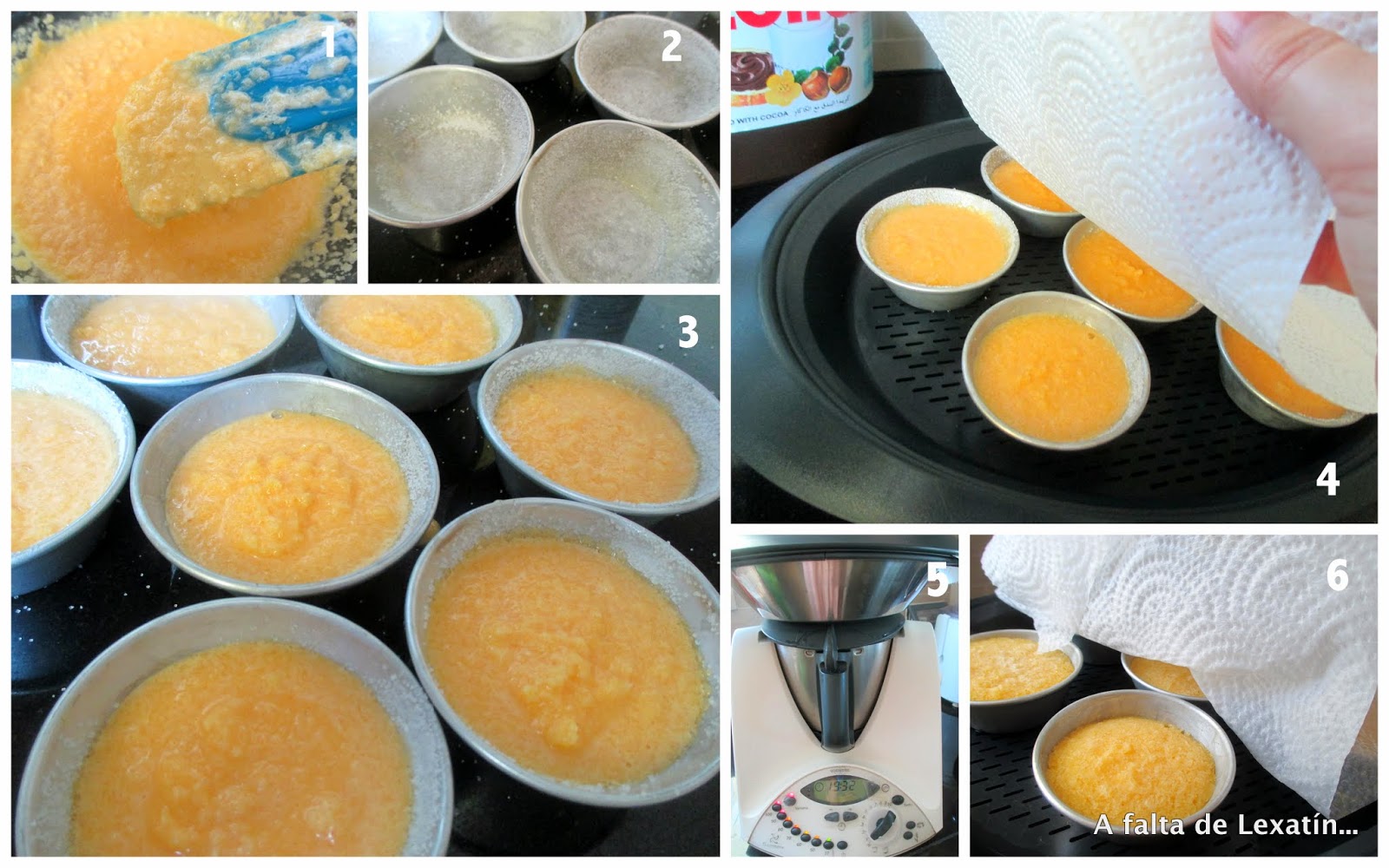 Rellenar los moldes hasta los dos tercios de su capacidad , colocar en la bandeja del varoma y cubrir con papel de cocina para que no entre agua en los moldes. Poner la tapa