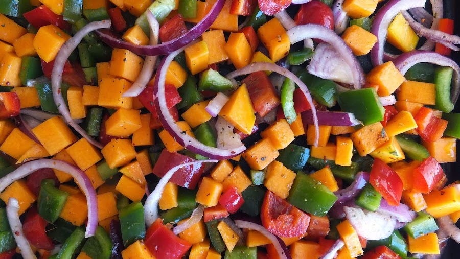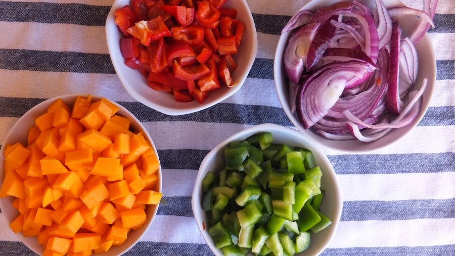 2. Precalienta el horno a 190ºC. Corta las cebolla en juliana y la calabaza (sin piel y sin pulpa) y los pimientos en dados pequeños.