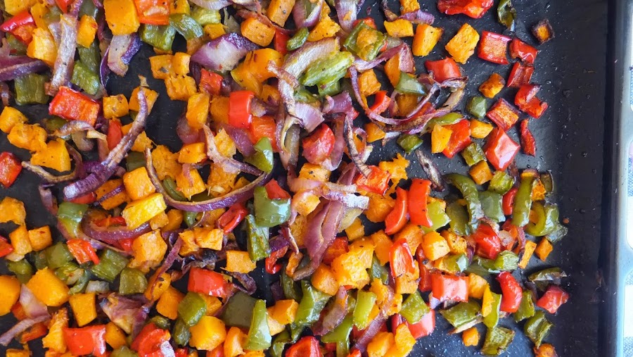 A esta categoría pertenece la receta que comparto hoy. Es la manera en que más me gusta y aunque normalmente suelo hacerla con verduras salteadas, merece la pena tomarse la molestia de encender el horno y asar las verduras porque el sabor que se consigue de esta manera es insuperable. Especialmente si hablamos de calabaza y de pimientos, que sudan y se secan hasta comprimirse en su propia esencia.
