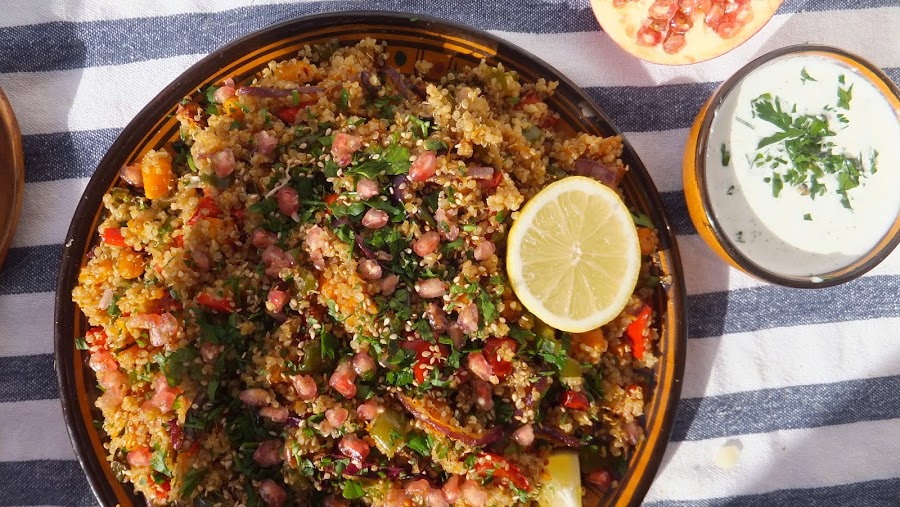 7. Emplata y decora con perejil fresco picado, granos de granada y semillas de sésamo. Echa un poco de aceite de sésamo sobre la quinoa.