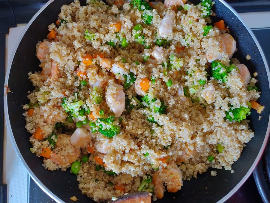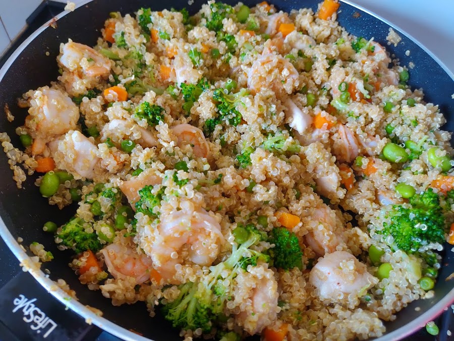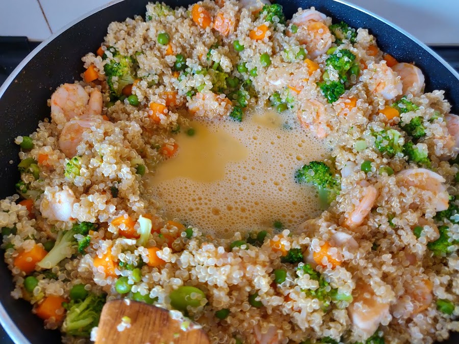 Seguidamente añadimos también la quinoa a la sartén y removemos bien todos los ingredientes.