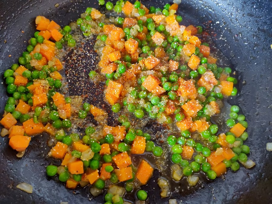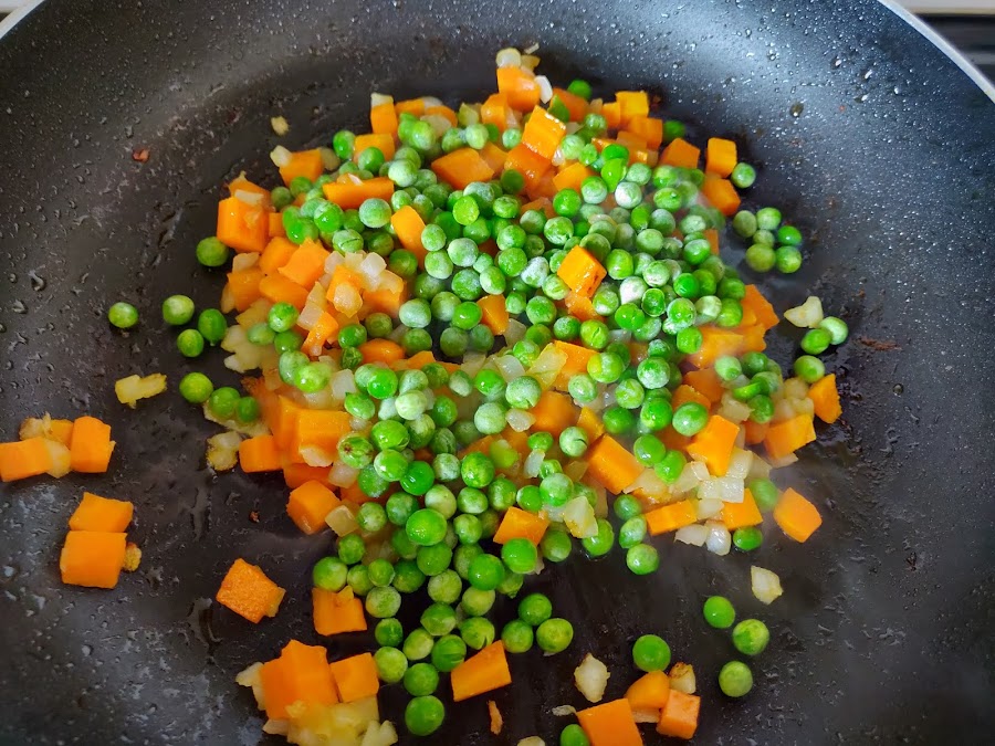 Seguidamente añadimos los guisantes congelados y dejamos a fuego bajo hasta que estén listos.