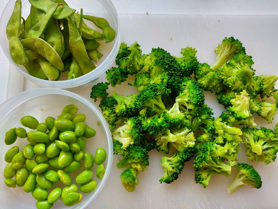 Paralelamente cocinamos al microondas el edamame y el brócoli 5 minutos a 700W cada uno.