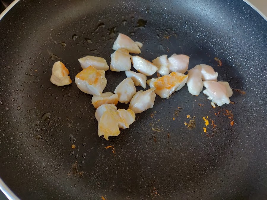 Para ello cortamos el pollo a dados, lo sazonamos y lo pasamos por la sartén a fuego alto.