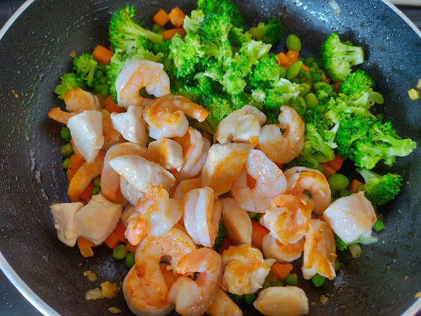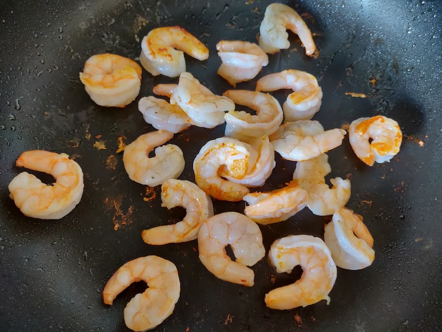 Seguidamente hacemos lo mismo con los langostinos, limpios y pelados; reservamos.