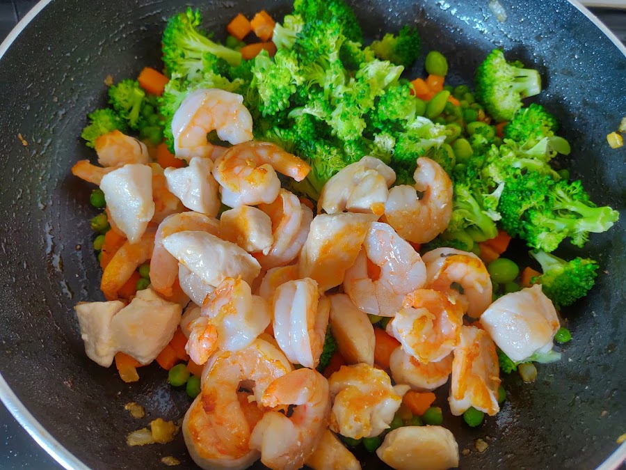 Añadimos todos los ingredientes a la sartén menos las quinoa.