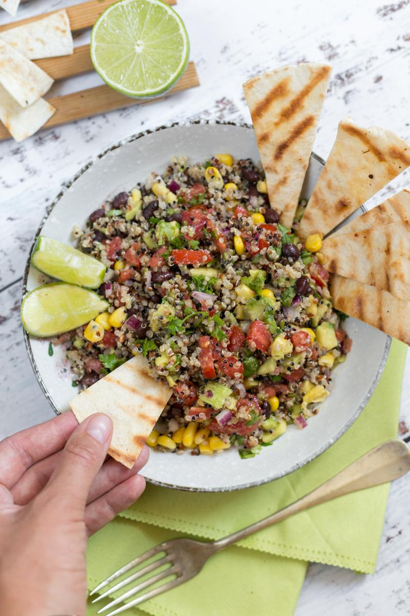 En esta línea quise compartir esta sencilla y original receta: un bowl vegetariano donde la quinoa y los porotos negros, al ser ricos en proteína, suplen muy bien la carne. Haciendo que este plato sea súper contundente y nutritivo. También tiene otros ingredientes muy frescos como la palta (aguacate), tomate y cebolla que se usan para hacer un pico de gallo, choclo (maíz) y tortillas de trigo, para darle todo el toque tex-mex.