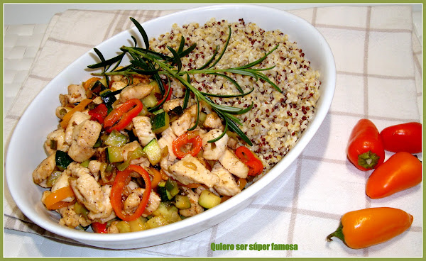 Preparar todos los ingredientes para "saltear". Cortar el pollo y las hortalizas a trozos pequeños.