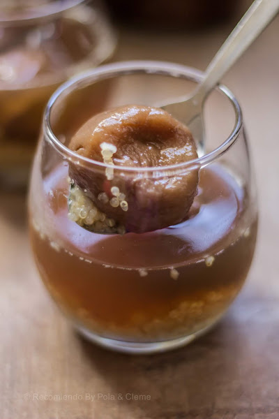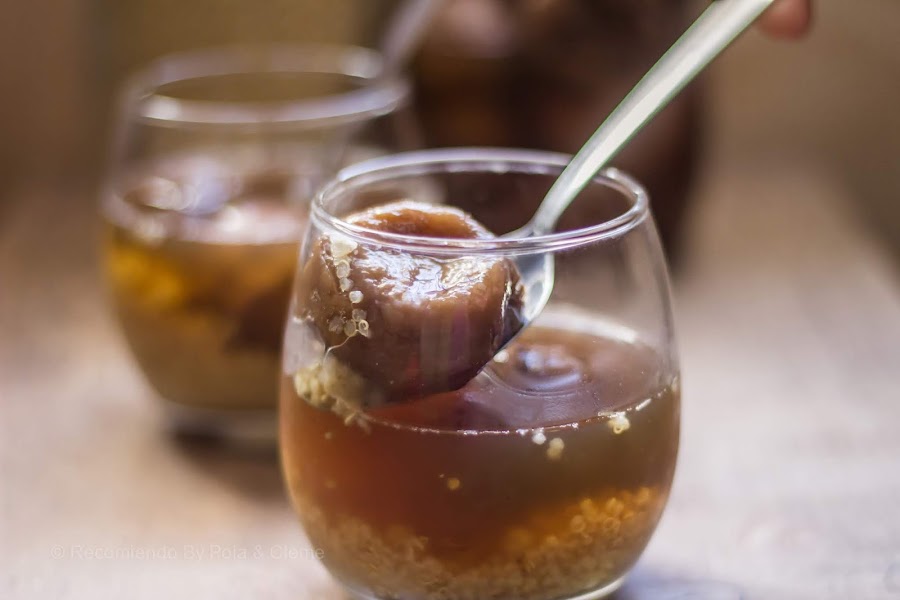 Hoy les traigo esta receta que es la variación del clásico mote con huesillo -bebida dulce que suele consumirse bien helada, como postre- ya que cambiamos el mote por quinoa. ¿Por qué? no porque no me guste el mote, al contrario, me encanta! Todo comenzó la primera vez que probé la quinoa, que preparé para un almuerzo, en reemplazo del arroz, y al comerla dije: "se parece al mote, pero en versión pequeña" y desde entonces pensé en intentar hacer esta versión. La verdad, me demoré bastante en decidirme, pero hace unos días, cuando fui al supermercado, a última hora, buscando ingredientes para hacer mote, resulta que estaba agotado (porque todos compraron a tiempo y yo no) así que pensé: "bueno, tendrá que ser con quinoa".