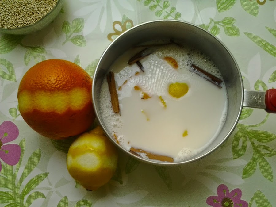 Pon en un cazo al fuego la leche con el edulcorante, las cáscaras de naranja y de limón y la canela. Baja el fuego antes de que la leche comience a hervir y retira las cáscaras y la ramita.