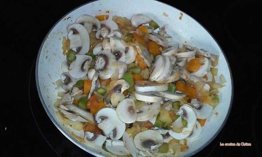 Cortamos las verduras en trozos pequeños y se sofríen en una sartén con tres cucharadas de aceite a fuego lento hasta que estén blanditas.