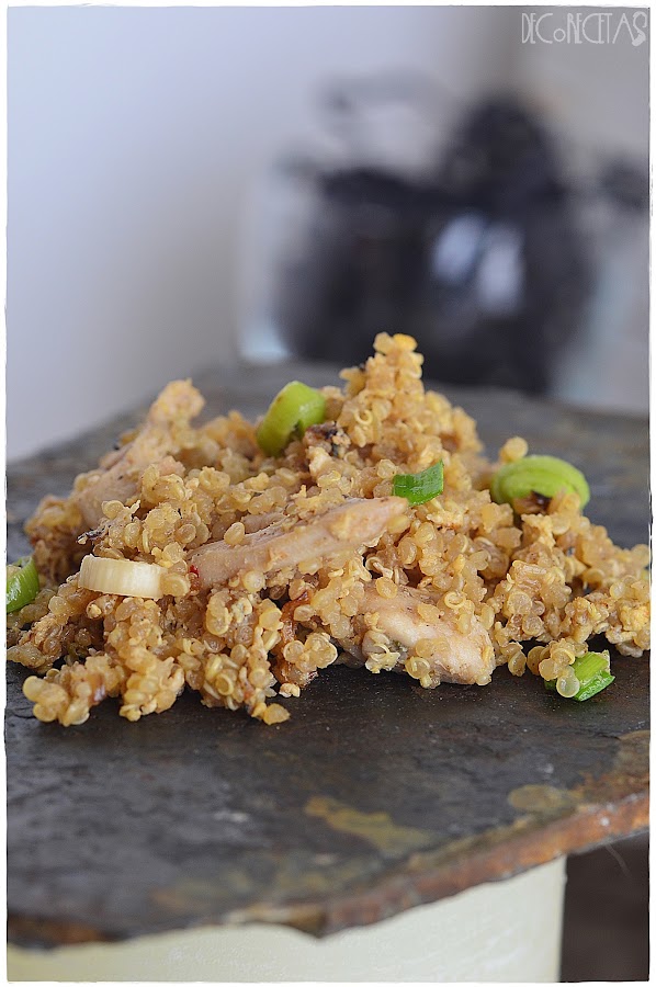 En el mismo wok, doramos la cebolla con el ajo. Agregamos los huevos batidos hasta que se cocinen, y a continuación la quinoa, el pollo dorado y por último, los ajetes tiernos apagando el fuego