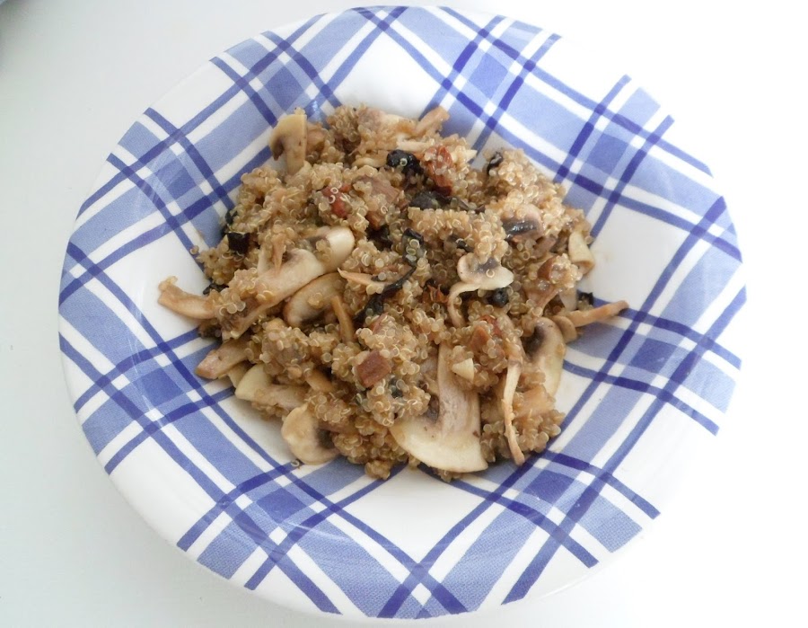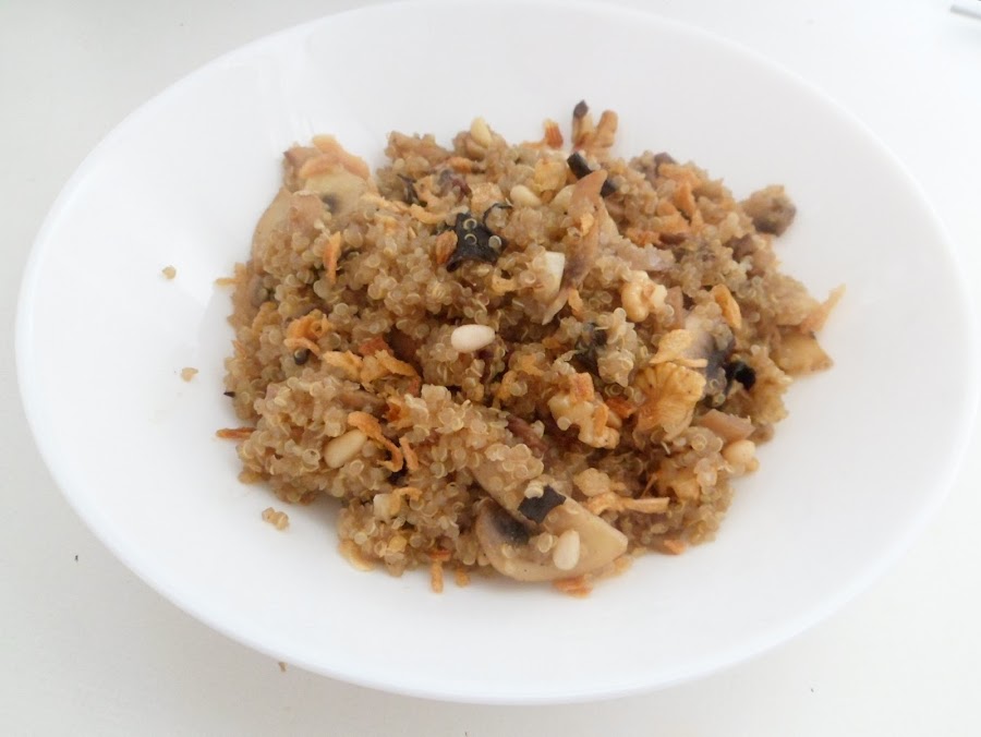 Cuando la quinoa esté lista, (deja que esté ya bien cocida y que el agua se haya reducido totalmente. Si no es así, retira la que sobra) aparta el cazo del fuego, añade los champiñones (incluye el aceite sobrante), las nueces, los piñones, un poco de sal y pimienta; ponlo en platos o cuencos y justo antes de servir incorpora por encima un poco de cebolla crijuente.