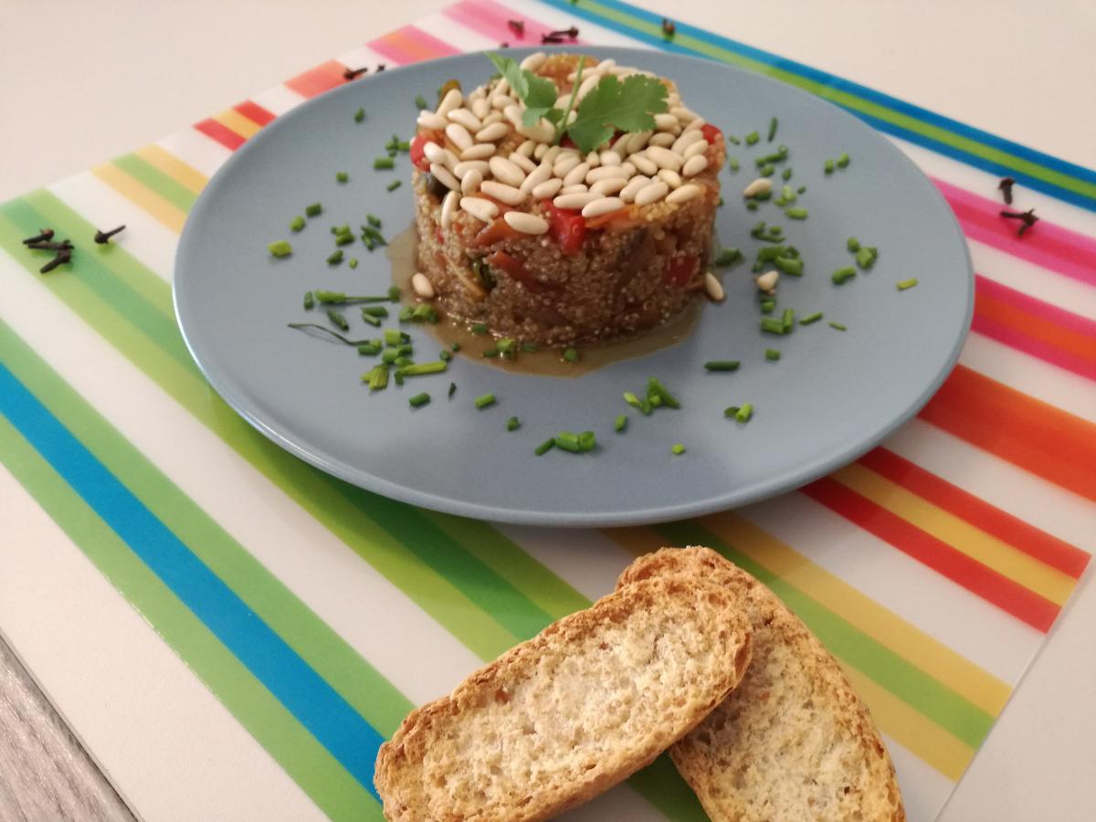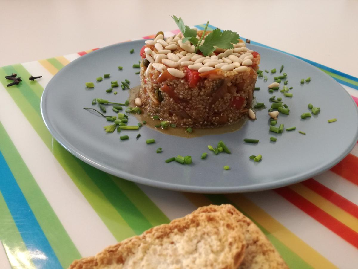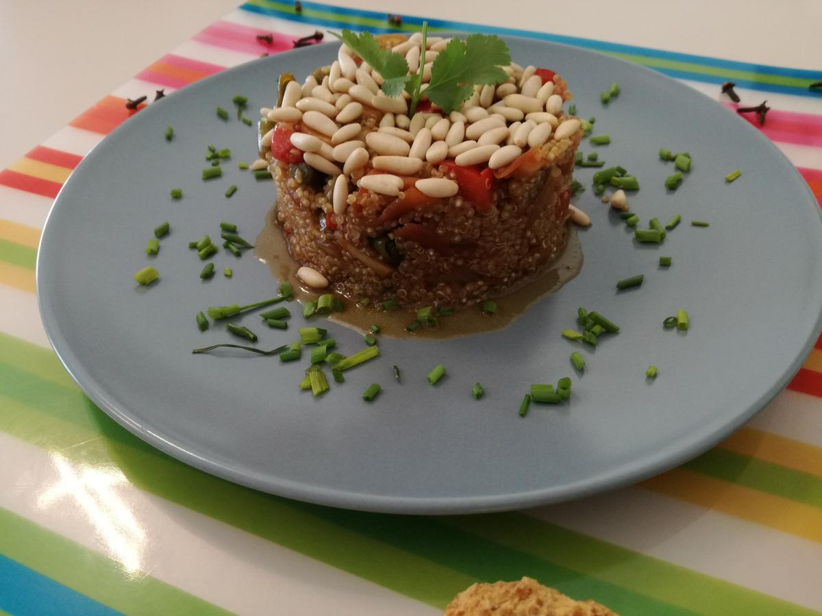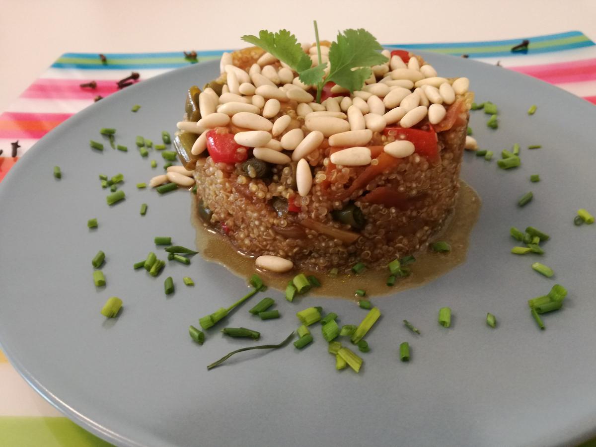 Esta receta de quinoa seguro que le gusta a todo el mundo. La salsa de soja combinada con la cebolla, pimiento, ajetes tiernos, champiñon… de ahí no puede salir nada mal!! Además los piñones le aportan un cambio de textura muy agradable.