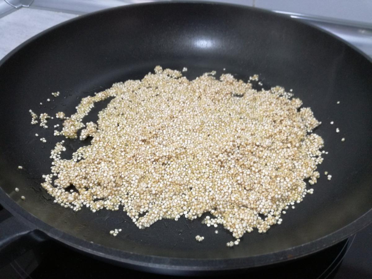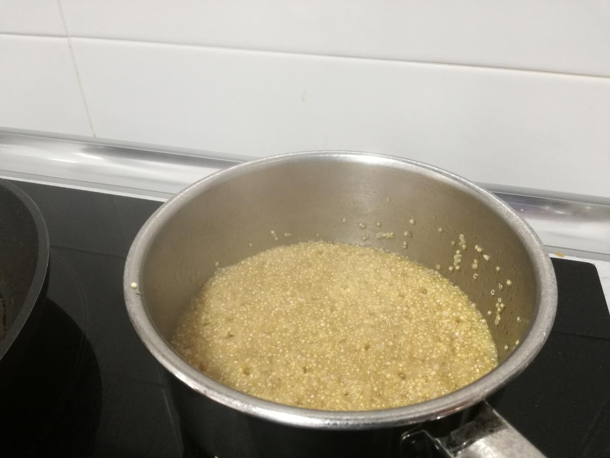 Con el agua ya caliente, el doble de agua que de quinoa (en este caso un vaso entero de agua), echamos la quinoa y dejamos cocer 15 minutos. Podemos remover de vez en cuando. El agua reducirá al máximo.