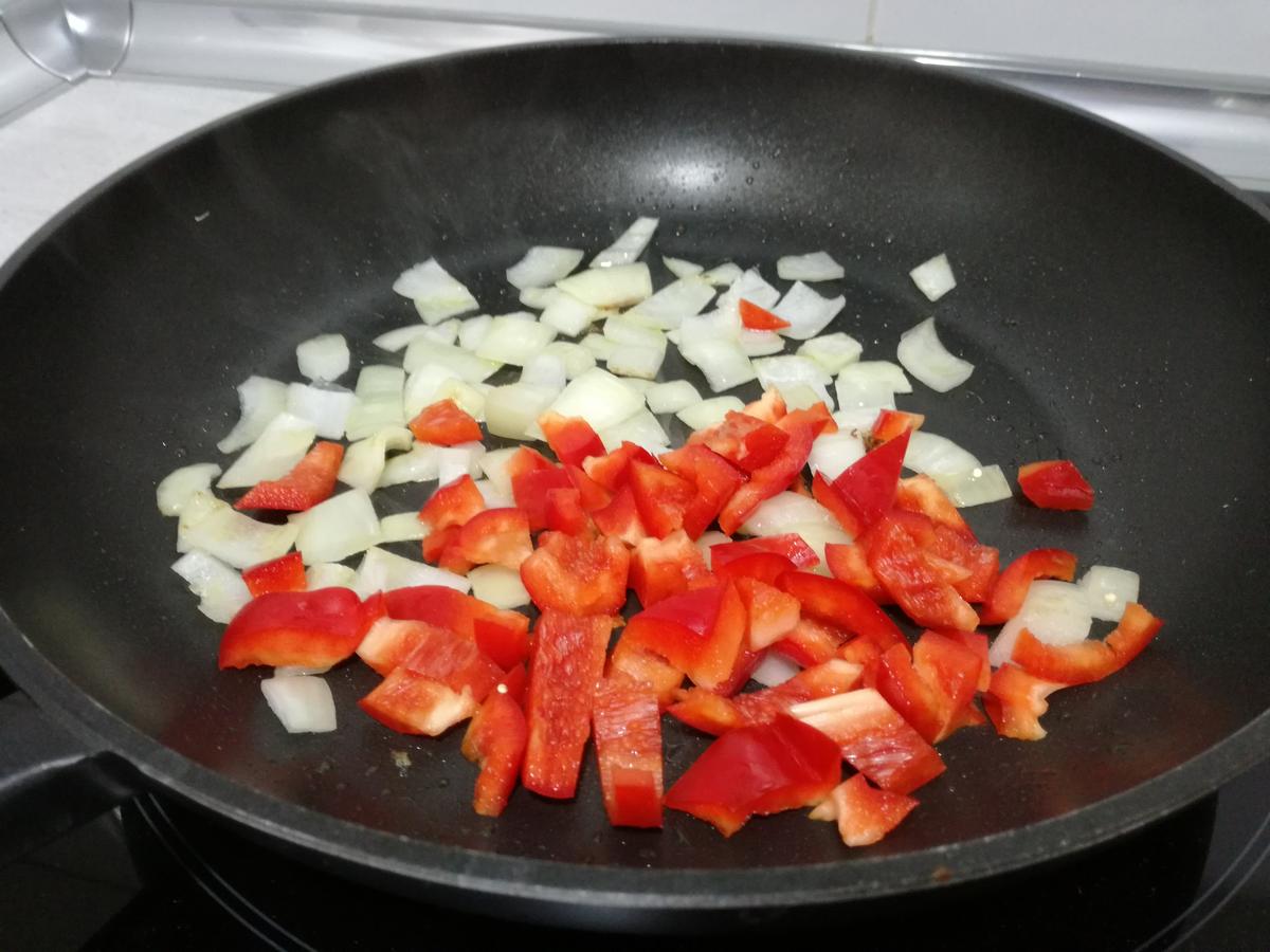Mientras vamos pochando las verduras. Primero la cebolla, cortada en cuadraditos, no hace falta que sean pequeños.