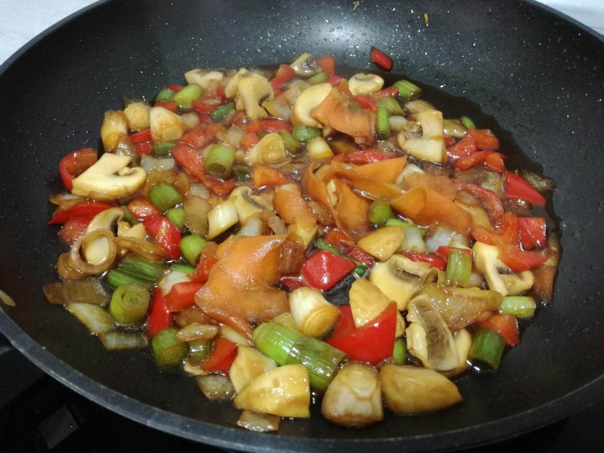 Una vez esté la verdura pochadita pero no demasiado, vertemos la salsa de soja, y dejamos reducir.