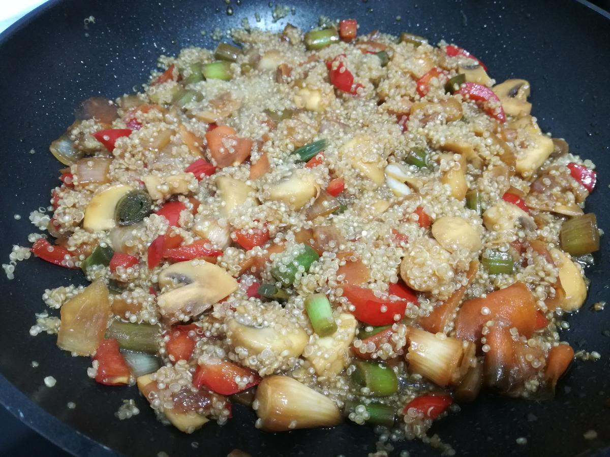 Vamos con todo a la par, por lo que la quinoa ya está al dente. Ahora echamos la quinoa junto con las verduras y la salsa de soja y removemos para que se integren todos los sabores.
