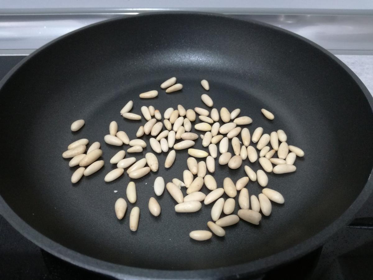 Mientras, en una sartén sin aceite ni nada, tostamos los piñones, con cuidado que no se quemen. Para ello removemos constantemente.