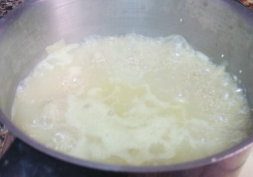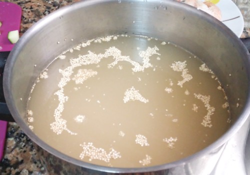 se pone a calentar el caldo hasta que hierva, momento en el que se le echa la quinoa. Se deja cocer unos 10 minutos