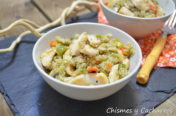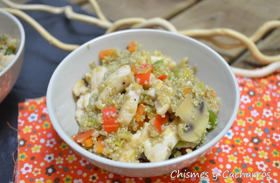 Freír el pollo cortado en tiras finas, antes añadirle un poco de sal y pimienta. Una vez frito el pollo, añadir las verduras y la quinoa a la sartén. Añadir un poco de salsa de soja (a tu gusto) y dejar hacer unos minutos. Servir al momento.