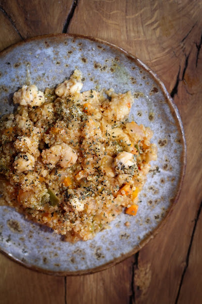 Lavamos muy bien la quinoa en un colador bajo el grifo, removiendo con las manos para eliminar la espuma que desprende, así evitaremos que quinoa amargue. Reservamos.