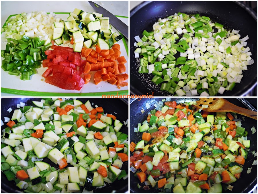 No frías demasiado las verduras, déjalas un poco duritas que luego con la quinoa se cuecen también.