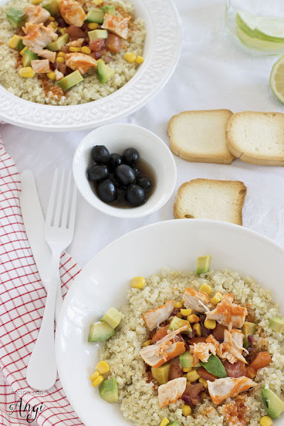 ¡Vuelvo al blog! Tras el parón veraniego-viajero vuelvo a las andadas, al trabajo y a la cocina. Y precisamente vuelvo con una receta de esas que soluciona la comida en un día de trabajo. Quinoa Tex Mex con pollo my way. De verdad, no sabéis lo cómodo que resulta tener quinoa preparada en la nevera y luego combinarla con vuestros ingredientes favoritos. En este caso los míos son cebolla, tomate, maíz, aguacate, pollo y una mezcla de especias con aire mexicano.