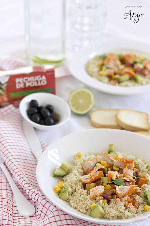 Por cierto ¿He oído otoño? pues bueno, sólo tenéis que leer mis publicaciones de estas fechas de años anteriores para saber qué opino acerca de la llegada del otoño. Que de verdad que no tengo nada en contra de esta estación, es sólo que, por muchas razones, adoro el verano. Es que parece que con el otoño y especialmente con octubre todo se acelere, a penas hay tiempo para hacer nada, las horas son las mismas pero la sensación con la falta de luz, pues no. Hay que organizarse de otra manera si queremos sacar provecho de los días y ver a la gente. Así que la verdad es que gracias a platos como esta Quinoa Tex Mex con pollo pues consigo aprovechar más el tiempo ya que puedo hacer para un par de veces porque se conserva muy bien.