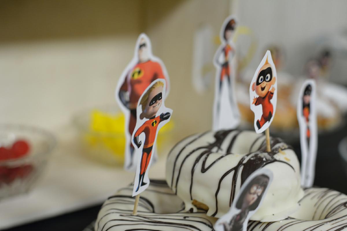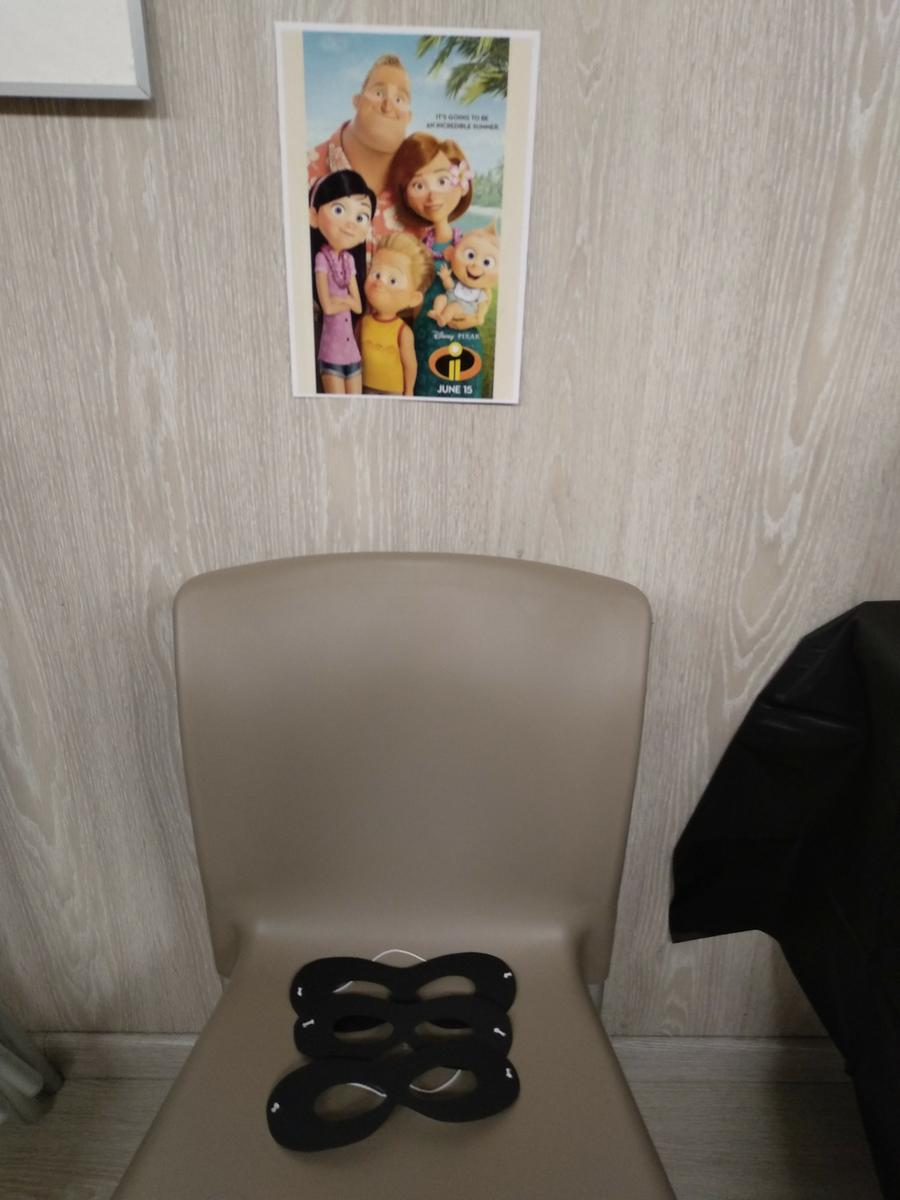 Hicimos máscaras para todos los niños con cartulina negra y goma elástica. Y encima colocamos una foto de los Increíbles sin máscara, como si se trataran de las auténticas máscaras de estos súper héroes.