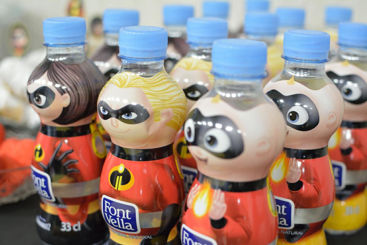 Las botellitas de agua pequeñas para mí siempre son un dilema, porque veo un montón de plástico innecesario. Es un tema pendiente que cumpleaños tras cumpleaños me planteo cómo reducirlo, ya que en nuestra vida diaria intento hacerlo. Cada pequeño gesto cuenta. A pesar de eso, esta vez cogí botellitas siguiendo la temática.
