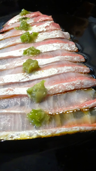Tiradito de pez limón con salsa de soja y kizami wasabi.